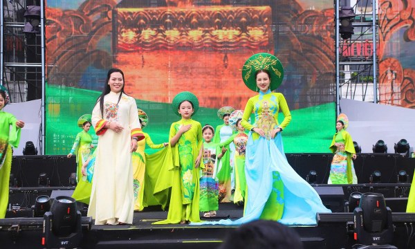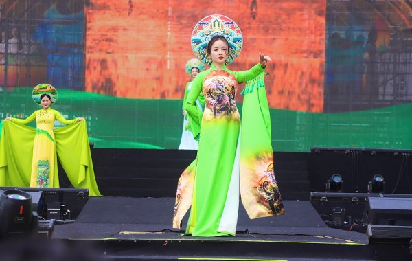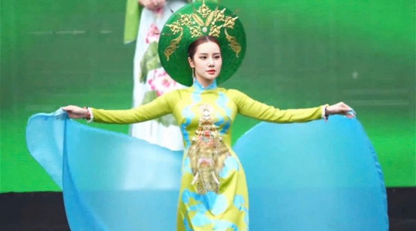 Đến với lễ hội áo dài, NTK Cao Thu Vân người sáng lập ra thương hiệu áo dài An An đã cho khán giả mãn nhãn với những tà áo màu xanh mát cùng những họa tiết được làm thủ công rất tỉ mỉ.