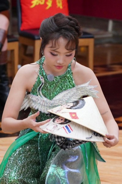 Phương Mỹ Chi còn chuẩn bị nón lá, sử dụng tại phần giao lưu ở hậu trường.