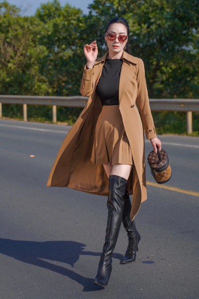 Chị phối đồ phong cách đối xứng với tông màu đen và nâu trong một chuyến đi chơi.