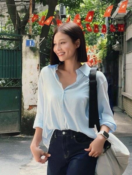 Trong ảnh, nữ diễn viên diện áo sơ mi xanh nhạt phối cùng quần jeans tối màu và túi vải trắng khoác vai, mang lại vẻ tự nhiên, năng động nhưng vẫn nền nã. Hình ảnh này hòa hợp với nhân vật Tú - cô gái hiền lành, chân thành, mộc mạc nhưng ấm áp và tràn đầy sức sống.