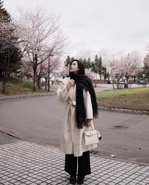Phong cách dạo phố Nhật Bản của Hoa hậu Phương Khánh, gồm áo khoác dạ dáng dài, quần ống loe, áo len sợi tua rua.
