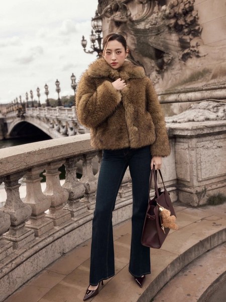 Hoa hậu Lương Thùy Linh cũng chọn áo lông khi theo đuổi phong cách công sở thanh lịch, với quần jeans ống loe, giày cao gót và túi tote.