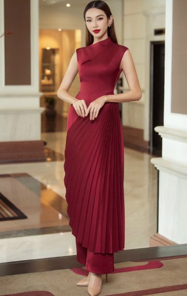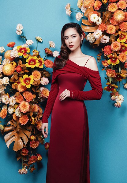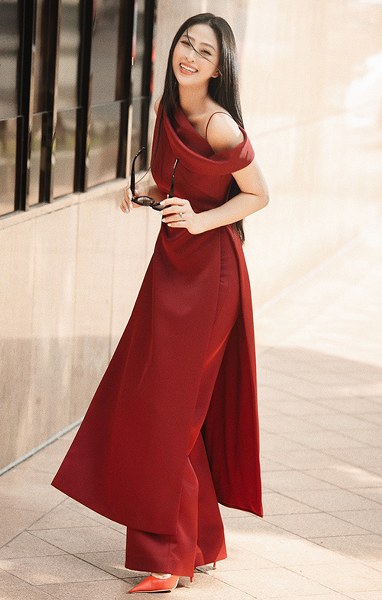 MC Liêu Hà Trinh xinh tươi với áo dài, giày cao gót ton-sur-ton đỏ rực trên phố Sài Gòn.