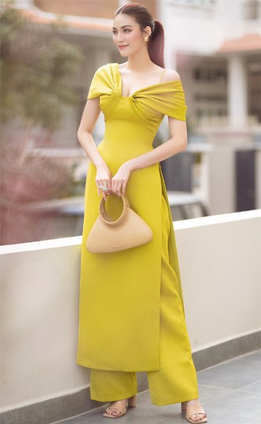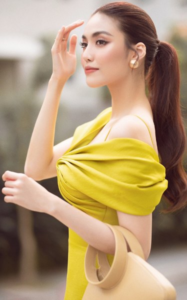 Hoa khôi Lan Khuê xuống phố trong trang phục màu cốm, vai áo trễ nải giúp tôn vẻ gợi cảm, quyến rũ của bà mẹ một con.
