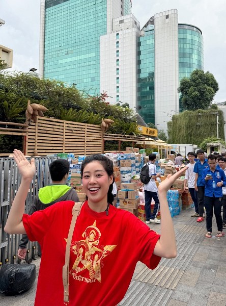 Hoa hậu Khánh Vân đến điểm tập kết ở Nhà văn hóa thanh niên TPHCM để cùng đội ngũ tình nguyện viên mang hàng hóa lên xe, kịp vận chuyển đến bà con miền Trung.