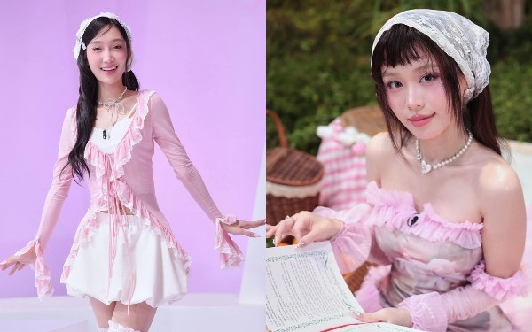 Juky San (trái) và Han Sara chọn phong cách đồng điệu gồm váy áo sắc hồng, phối cùng tất, mũ ren.