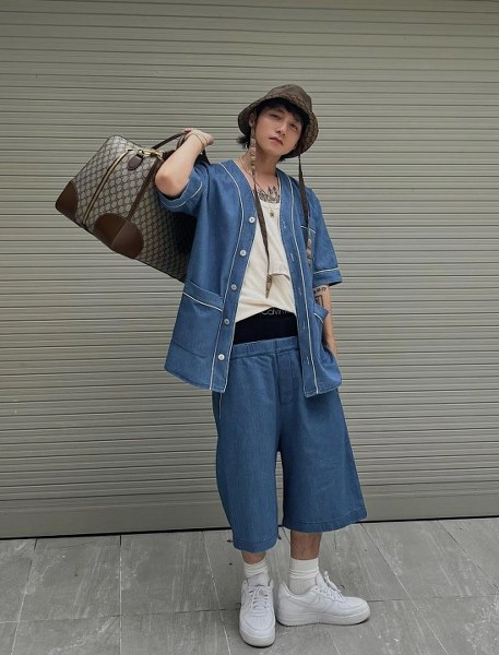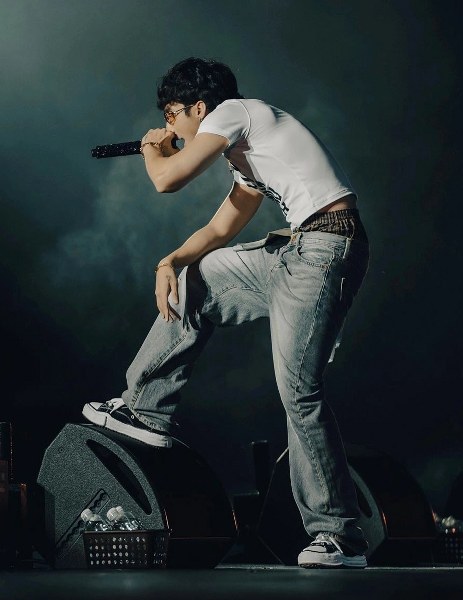 Kiểu mặc quần cạp trễ khoe nội y thường xuyên được ca sĩ áp dụng. Trong một lần biểu diễn ở Cần Thơ, anh chọn quần jeans mài bạc và quần đùi kẻ nâu, kết hợp crop top và giày Converse.