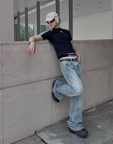 Ngôi sao khoe cạp quần Balenciaga với quần jeans ống đứng và mốt giày xấu. Điểm nhấn trên gương mặt là cặp kính phong cách Matrix.
