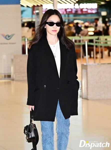 Tờ Newsen đánh giá cao phong thái của Song Hye Kyo trong chuyến công tác tháng 8/2024, "áo quần không phô trương mà vẫn toát lên nét cuốn hút, củng cố vị thế minh tinh hàng đầu Hàn Quốc". Cô phối áo Sessùn với quần denim, túi Fendi.