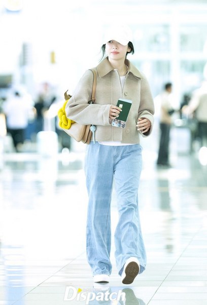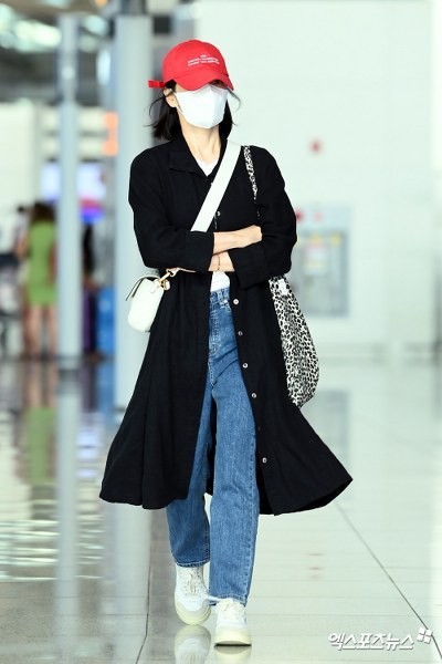 Lần khác đến Paris, Pháp dự sự kiện, minh tinh Hàn phối áo khoác mỏng dáng dài với áo thun, quần jeans, giày thể thao Autry Action, mũ lưỡi trai Rokh. Cô tăng vẻ sang trọng với túi xách Fendi đeo chéo, phối thêm mẫu túi họa tiết da báo của hãng Emis.