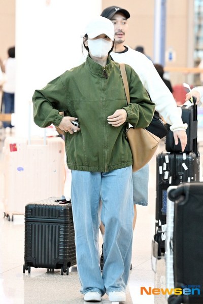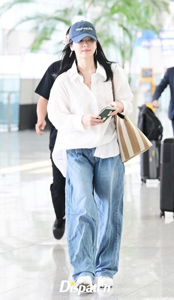 Về Hàn sau chuyến công tác tháng 9 năm ngoái, diễn viên 44 tuổi diện áo khoác rêu hiệu Gramicci, quần jeans ống rộng, nhấn vào túi Fendi. Giày Converse và mũ lưỡi trai Assembly New York trắng đồng điệu giúp Hye Kyo tăng vẻ năng động, "ăn gian" tuổi.