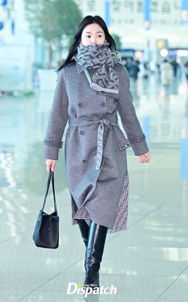 Lần xuất ngoại hồi tháng 1/2024, minh tinh ghi điểm với set đồ gồm khăn choàng, trench coat xám Fendi, boots da The Row và túi xách đen.