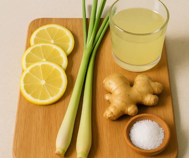 Nguyên liệu: 1 quả chanh, 1 nhánh sả, 1 củ gừng nhỏ, 100ml nước mía, 1/4 thìa cà phê muối biển.