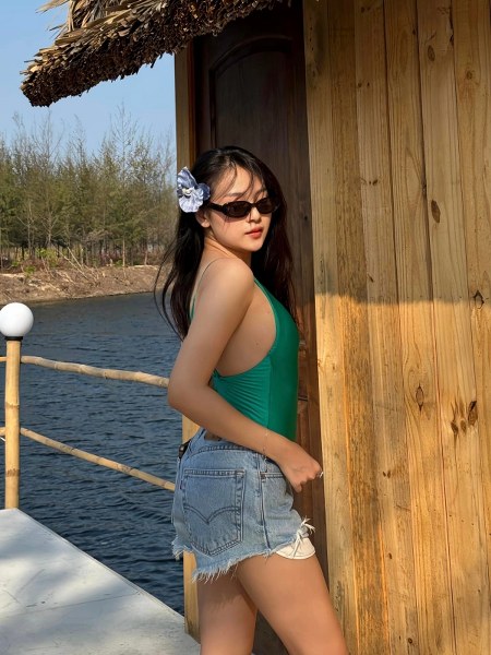 Triều Dâng diện mốt ngực trần với áo xẻ ngực và hở lưng, kết hợp quần jeans, giúp diện mạo vừa năng động vừa gợi cảm.