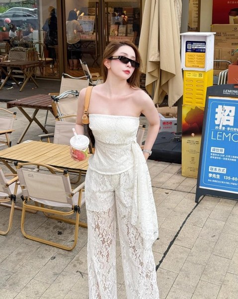 Cách mặc cả "cây" đồng điệu cũng được diễn viên Quỳnh Nga theo đuổi. Cô dùng túi đeo vai Louis Vuitton và kính Gucci tạo điểm nhấn cho bộ cánh bằng ren.