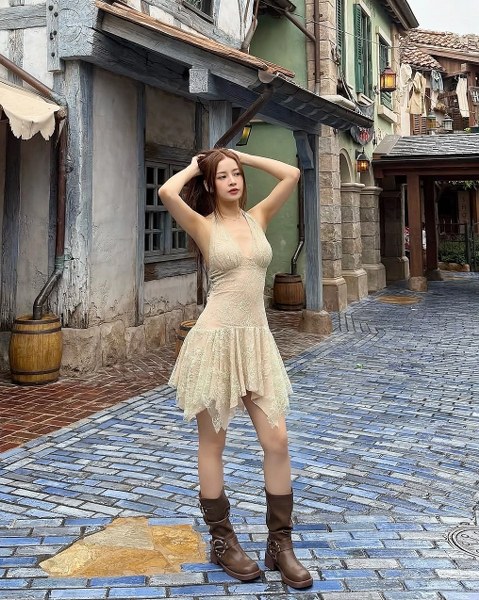 Chi Pu hưởng ứng phong cách boho với váy ren hạ eo và bốt cao cổ.