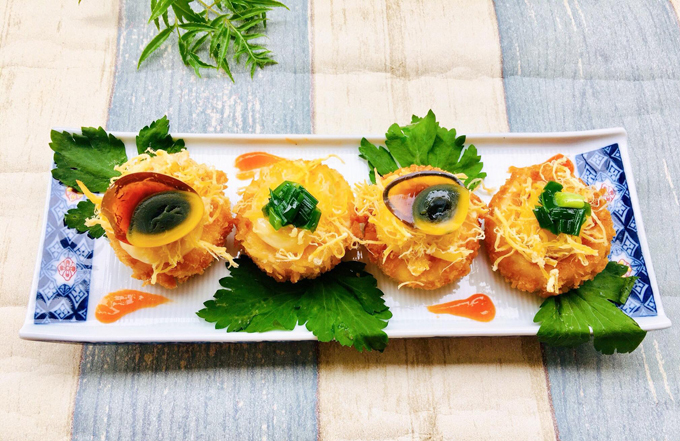 Đậu hũ với lớp vỏ giòn, bên trong béo mềm, ăn kèm trứng bắc thảo lạ miệng, vị mằn mặn của chà bông khiến món ăn trở nên hấp dẫn. Đây sẽ là món khai vị tuyệt vời trong các bữa tiệc.