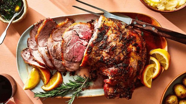 Bày thịt đùi cừu nướng cùng rau củ đã nướng ra đĩa. Nếu bạn chưa quen ăn thịt cừu hoặc e ngại mùi đặc trưng, mức độ chín tới với lớp mỡ giòn tan này sẽ giúp giảm mùi gây đáng kể.