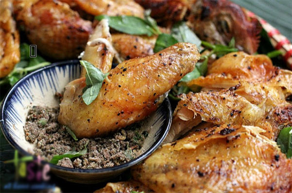 - Trong khi nước gà, cho muối hột vào nồi đất thường dùng kho cá rồi cho chung vào lò nướng luôn để làm muối hầm. Gà nướng xong lấy nồi muối ra, lợi dụng sức nóng của nồi để cho hạt mắc khén vào rang nóng. Xong cho tất cả vào cối giã cùng ớt và chút rau răm là sẽ có hỗn hợp gia vị chấm thịt gà ngon hơn muối tiêu bình thường rất nhiều.