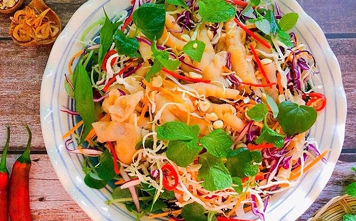 Gỏi bắp cải ăn kèm chân gà rút xương vị chua ngọt mát dễ ăn, dùng làm món khai vị rất phù hợp.