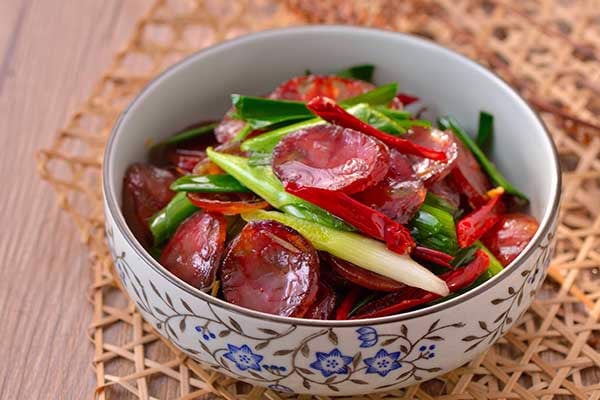 Bước 3: Khi rêu tỏi đã gần chín, trút lạp xưởng vào xào chung khoảng 5 phút rồi cho ra đĩa và thưởng thức.
