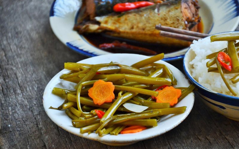 Rau muống giòn vị chua ngọt thích hợp khi ăn chung với các món kho hoặc nướng.