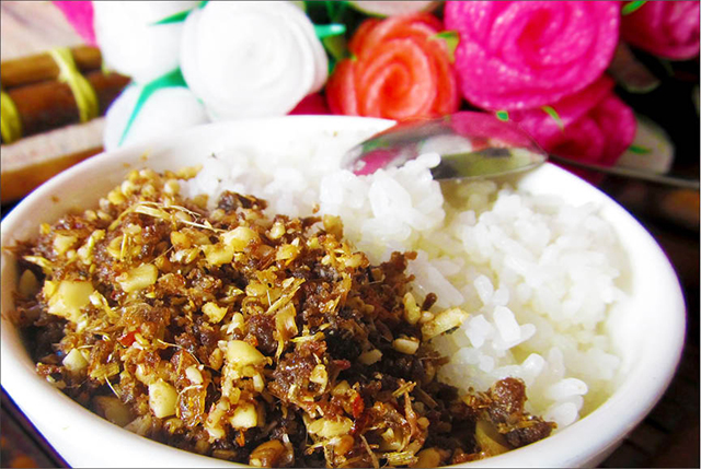 Thịt ba chỉ và thịt bò bắp được kho cùng với sả, mắm ruốc, thêm ớt ăn cay cay được kho khô. Bạn có thể kho nhiều và để dành trong tủ lạnh ăn dần.
