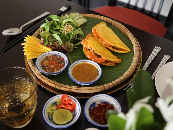 Tại nhà hàng Le Parfum của Azerai La Residence Huế, du khách sẽ được thưởng thức một phiên bản bánh khoái được chế biến công phu và tinh tế với phần bột gạo vàng giòn với nhân tôm, thịt và giá đỗ, ăn kèm với nước lèo đậm đà được chế biến từ đậu phộng, gan heo, mè và tương đậu nành.