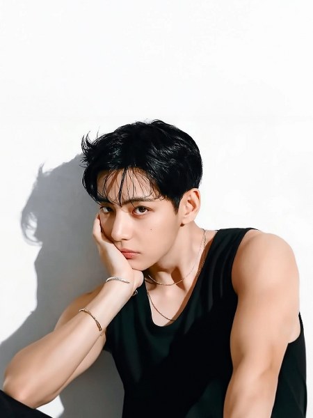 Kim Taehyung (V) - thành viên nhóm nhạc BTS - ở vị trí thứ bảy. Anh 31 tuổi, có gương mặt hài hòa, đôi mắt gợi vẻ quyến rũ. Nam thần tượng từng nhiều lần xếp thứ hạng cao trong các cuộc bình chọn về nhan sắc.