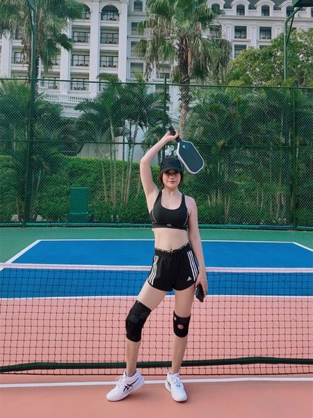 "Mỗi buổi chơi pickleball ít nhất 2 tiếng, lần nào cũng đổ mồ hôi như tắm vì môn này đốt calo rất tốt. Trong khi đó, tôi tập gym chỉ 1 tiếng vì chế độ tập khá nặng", diễn viên nói.
