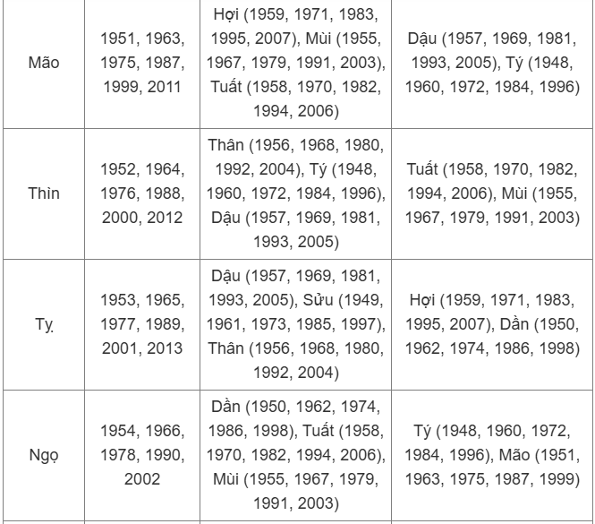 - Tuổi Mão: Tân Mão (1951, 2011), Quý Mão (1963), Ất Mão (1975), Đinh Mão (1987), Kỷ Mão (1999)