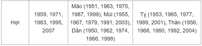 - Tuổi Hợi: Kỷ Hợi (1959, 2019), Tân Hợi (1971), Quý Hợi (1983), Ất Hợi (1995), Đinh Hợi (2007)
