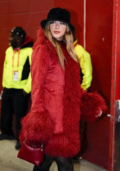 Năm 2024, trong lần đến đến sân vận động Arrowhead, Taylor Swift chọn áo khoác dài màu đỏ với cổ áo và gấu tay bằng lông nhân tạo, mang quần tất và bốt đen cao đến đầu gối.