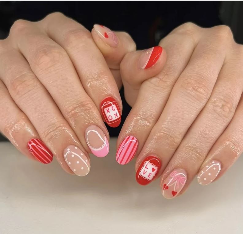 Lấy cảm hứng từ các màu sắc biểu tượng của tình yêu như đỏ và hồng, kiểu sơn móng cầu kỳ này mang đến sự nổi bật và đặc biệt cho đôi tay của bạn. Những chi tiết vẽ tỉ mỉ và sự kết hợp hoàn hảo giữa các gam màu tạo nên một bộ móng lãng mạn, như thể tình yêu luôn chứa đựng những khoảnh khắc bất ngờ và ngọt ngào.