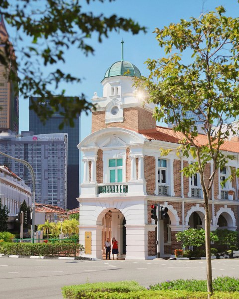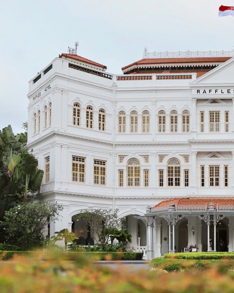 Ngay sau CHIJMES, Raffles Hotel Singapore gây ấn tượng bởi phong cách kiến trúc Neo-Renaissance. Tòa nhà có mặt tiền sơn trắng, các dãy cột đối xứng, mái ngói đỏ, bố cục ba tầng vuông vức, hành lang thoáng đãng, hiên nhà rộng, cùng những ô cửa sổ vòm chịu ảnh hưởng từ kiến trúc thuộc địa Anh, tạo nên cảm giác vừa uy nghiêm vừa thanh lịch.