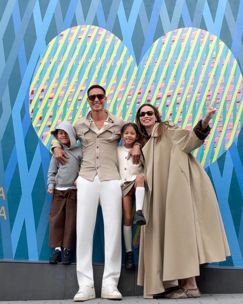 Trang phục dạo phố với tông màu be theo phong cách thanh lịch. Bé Lisa và Leon cùng mặc sweatshirt theo phong cách preppy. Hà Hồ chọn váy midi lụa màu kem, kết hợp sandals quai mảnh theo phong cách thập niên 1990. Kim Lý phối blazer màu kem cùng quần và giày loafer nâu.