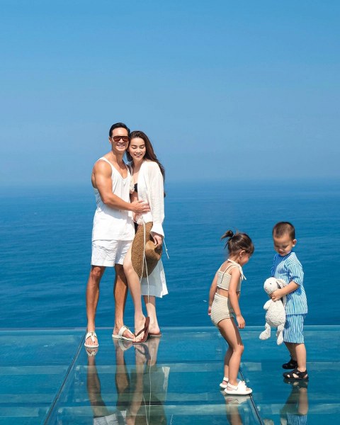 Trong lần đi du lịch đầu tháng 1, khi dạo chơi trên biển, ba bố con diễn viên Kim Lý diện trang phục sắc xanh. Hà Hồ chọn bộ đồ xếp bèo và bo chun lấy cảm hứng từ nội y thời kỳ Victoria, phối túi nhựa màu hồng, tạo vẻ nữ tính.