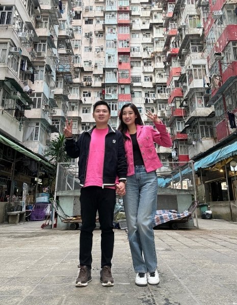 Khi đến thăm khu chung cư Montane Mansion nổi tiếng ở Hong Kong, họ cùng phối trang phục tông hồng và đen với sneakers.