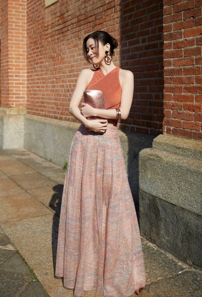 Ở sự kiện trước đó vài ngày, người đẹp chọn đầm maxi họa tiết hoa từ Alice + Olivia, phối giày đế đỏ màu sắc rực rỡ. Fan nói trông Xa Thi Mạn như "nụ hoa xuân đang nở rộ".
