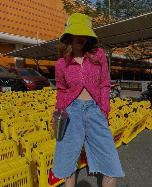Muốn thể hiện sự mới mẻ trong các phối màu thời trang, phái đẹp có thể tham khảo việc mix mũ neon cùng áo sơ mi hồng, quần jeans xanh của Yến Trang.