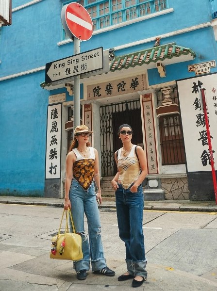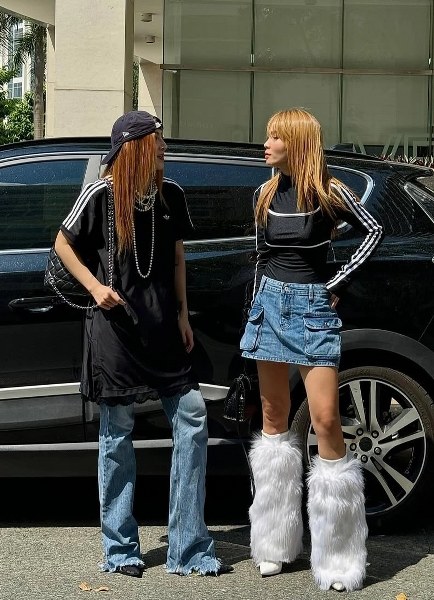Phong cách đường phố của chị em với đồ denim và áo thể thao màu đen.