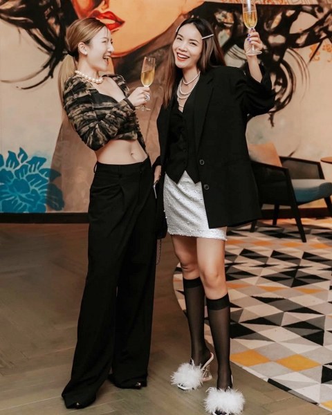 Cả hai theo đuổi mốt màu nâu hot nhất năm 2025. Yến Nhi thể hiện phong cách với váy suit công sở, tạo phóng khoáng bằng giày loafer và tất trắng. Yến Trang hóa quý cô với đầm bất đối xứng xếp nếp theo phong cách Hy Lạp.