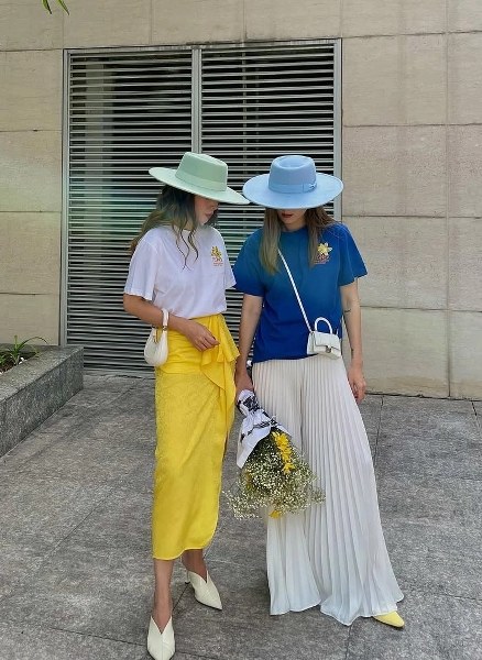 Cùng phối áo phông, chân váy, mũ rộng vành và dép cao gót nhưng cả hai vẫn tạo được nét riêng. Yến Trang chọn chân váy bất đối xứng dáng tulip. Yến Nhi diện váy maxi chữ A dài quét đất.