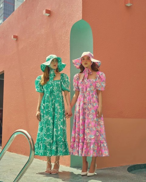 Hai người đẹp phối váy hoa tay bồng đồng điệu mũ tai bèo. Yến Nhi gợi ý kết hợp sandals quai mảnh, chị gái cô chọn giày cao gót mũi nhọn.