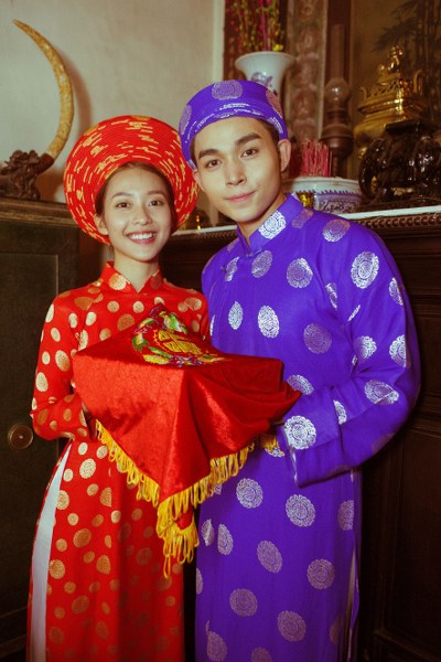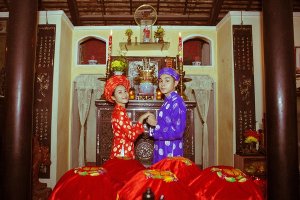 Một trang phục khác cũng tạo sự tò mò không kém đó là bức hình áo dài khăn đóng "cộp mác Việt Nam" vừa tuân theo lễ nghĩa, vừa có nét riêng thu hút khi cô dâu-chú rể cùng trau nhau lời hẹn ước trước bàn thờ tổ tiên.