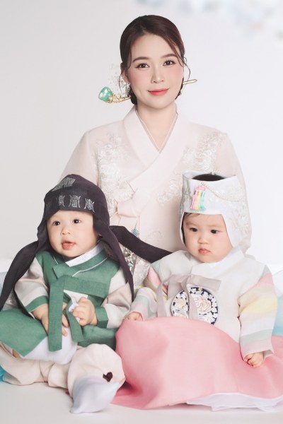 Người đẹp cho hai con mặc hanbok chụp hình.