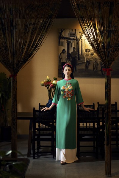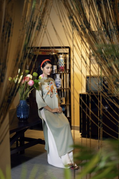 Về chất liệu, NTK đã chọn lựa sự kết hợp giữa lụa Nhật Bản và lụa Việt Nam vừa đảm bảo sự thoải mái khi mặc vừa tôn lên vóc dáng người phụ nữ Việt.