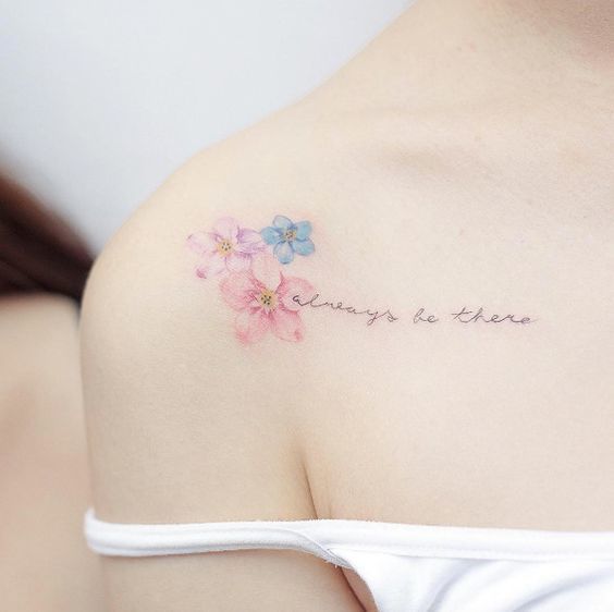 Mẫu tatto mini hình những đóa hoa xinh xắn, dễ thương màu nhạt cùng dòng chữ "always be there" như là lời nhắn nhủ của ai đó "luôn luôn ở bên"..