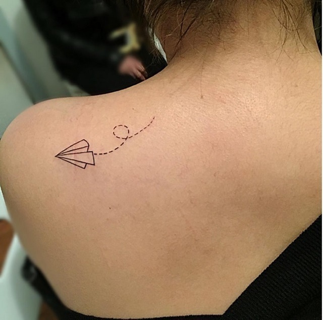 Một chiếc máy bay giấy và đường bay như bay trên một cơn gió nhẹ. Lại là một mẫu hình xăm nhỏ đầy ngẫu hứng cho những cô nàng cá tính…