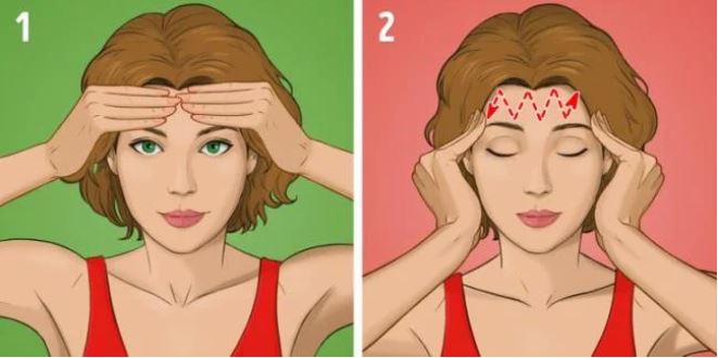 Bước tiếp theo, bạn đặt 2 bàn tay lên trán, các ngón tay chạm vào nhau rồi massage theo hình zic zac từ giữa trán ra 2 bên thái dương. Động tác này được ví như cách xoa bóp trị đau đầu vì nó sẽ giúp máu lưu thông tốt hơn.